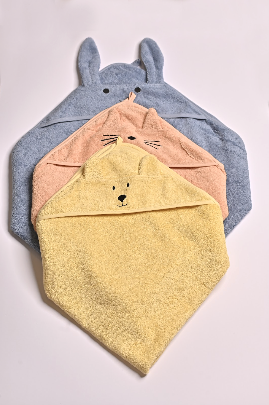 Introducing our delightful hooded towels – a whimsical touch to bath time, crafted with the pure softness of organic terry cotton. Our towels, bearing the GOTS certification, ensure freedom from harmful chemicals, providing a safe and natural embrace for your baby or toddler. This plush material boasts exceptional absorbency, swiftly and effectively drying your little one after each bath. With a generous size, it offers full coverage for an effortlessly cozy wrap. Explore a selection of fun and gender-neutral designs that bring excitement to your baby's bath time.